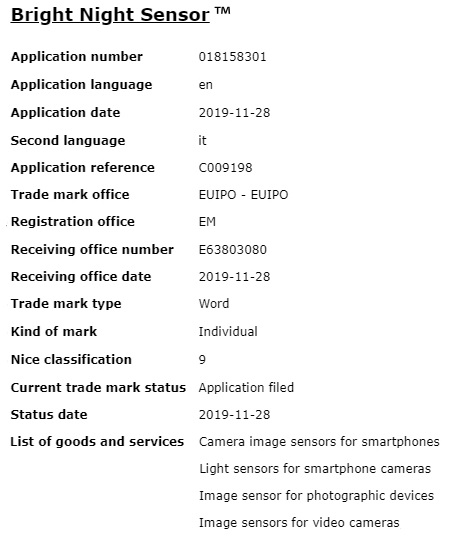 從三星申請的商標名稱Bright Night Sensor來看,這應該是一枚主打夜拍的相機傳感器,同時三星還有望采用自家的圖像傳感器組件。同時這項專利是由三星電子于2019年11月28日向歐盟知識產權局(EUIPO)提交的第9類申請,其涵蓋了攝像機/攝影設備/智能機/平板電腦的圖像或光傳感器等產品線。