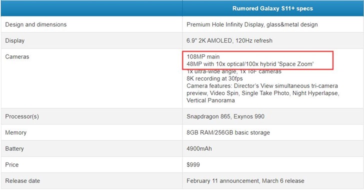 此前有爆料稱三星Galaxy S11有望采用1.08億像素的主攝和五倍光學變焦鏡頭,以及Space Zoom、Single Take和Video Spin等特色功能。而三星Galaxy S11+將搭載108MP主攝、48MP副攝,外加一顆超廣角鏡頭和一個ToF鏡頭,支持10倍光學變焦和100倍混合變焦,有高通驍龍865和三星Exynos 990兩種處理器版本,內置4900mAh電池,價格999美元。